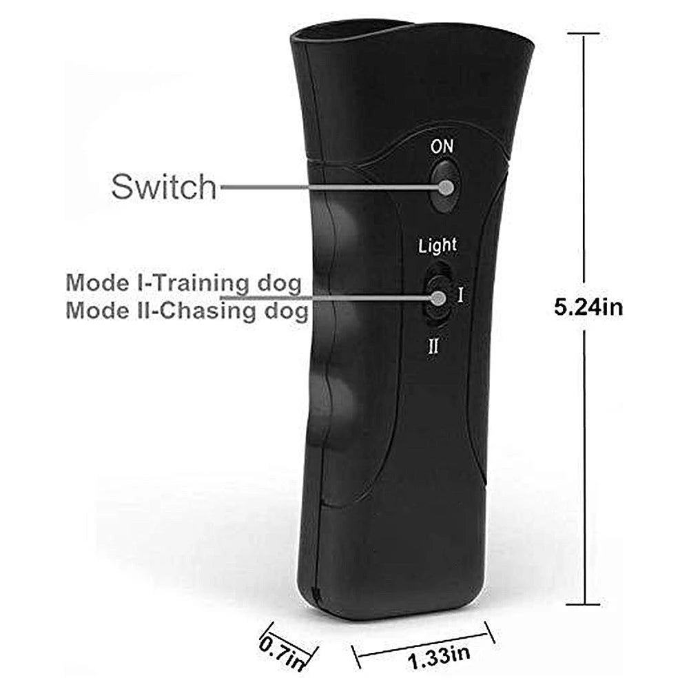 Material: ABS Size: 14x 6x 3 cm Please pay attention: Not Include Battery (9V Battery) Usage: 1.train:switch to choose "I" gear,press the "No" button emit ultrasonic,to train dog. 2.chaser:choose "II" switch gear,press the "No" button emit ultrasonic,dogs afraid to close to you. 3.light:choose "light" switch gear,can be used as a flashlight.